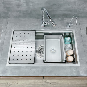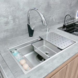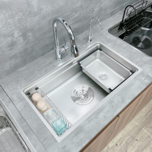 - Thiết kế hiện đại với gờ hạ bậc – tích hợp phụ kiện thông minh: Siphon, giá úp bát inox, chậu rửa nhỏ, thớt inox, thớt inox lỗ , giá xà phòng.