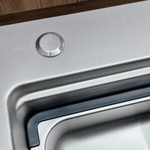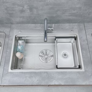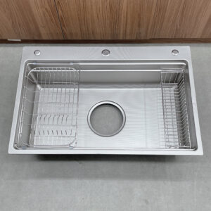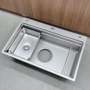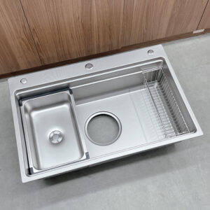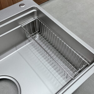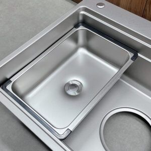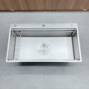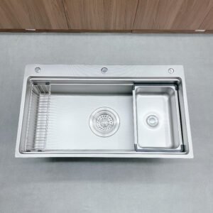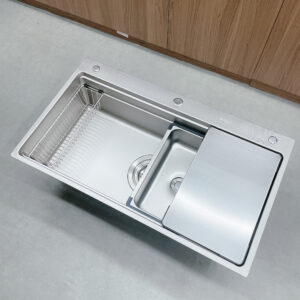 - Thiết kế hiện đại với gờ hạ bậc – tích hợp phụ kiện thông minh: Siphon, giá úp bát inox, chậu rửa nhỏ, thớt inox, thớt inox lỗ , giá xà phòng.
