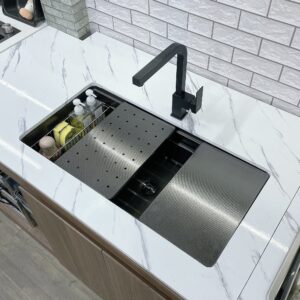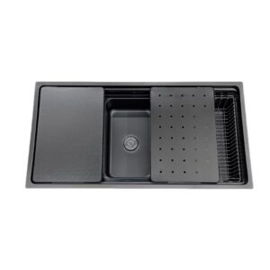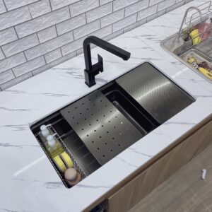- Thiết kế hiện đại với gờ hạ bậc – tích hợp phụ kiện thông minh: Siphon, giá úp bát inox, chậu rửa nhỏ, thớt inox, thớt inox lỗ , giá xà phòng.